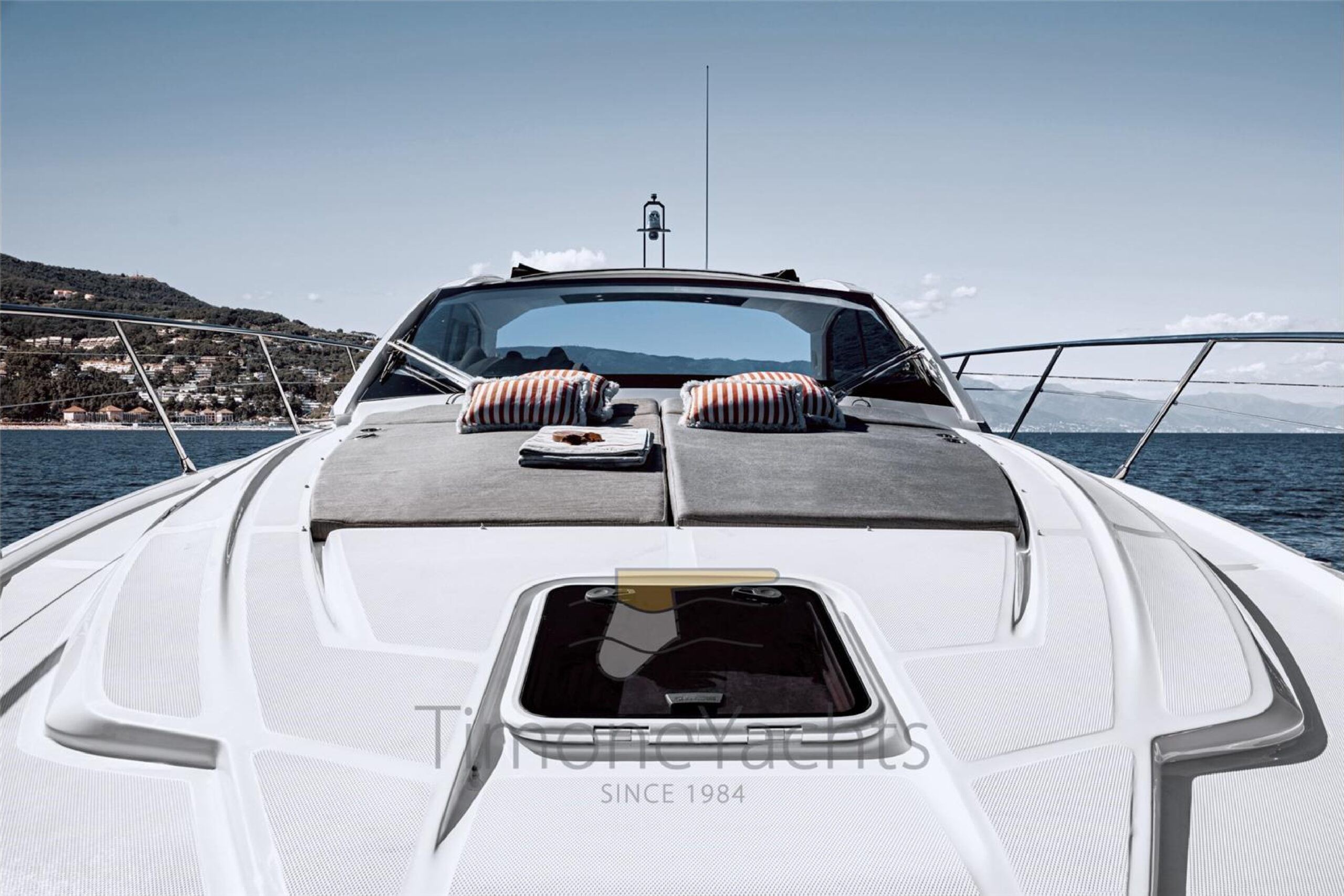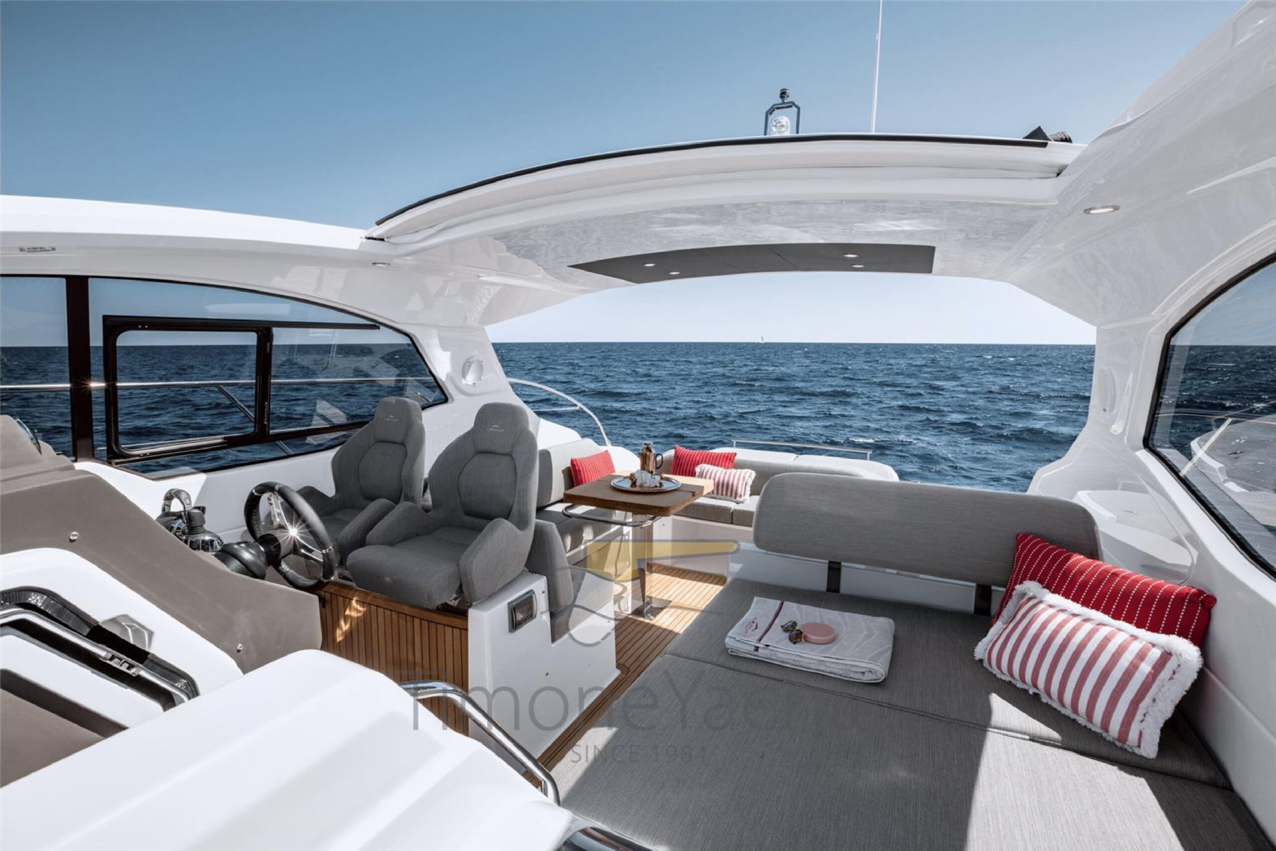 Athletic splendor with a chic design appeal, the Atlantis 45 is optimized for peak performance, top comfort and effortless elegance.Well-organized living spaces create a liberating dynamic on the main deck, while spacious interiors evoke an airy, lively mood. Versatile design adaptations cater to diverse lifestyle demands, as the contrasting synergy of materials, from matte to glossy details, inspires a neat sense of style. Free your spirit on the Atlantis 45. The Atlantis 45 is a pure coupe, despite the class-leading living areas. The volumes are disguised by long, sleek lines across the profile. With a mastery of both proportion and stance, Atlantis 45 appears both quick and graceful, an impression proven true by the experience at the helm. The bow and stern are spotted with sunbeds, made of advanced materials. The choice of Batyline fabric and Dryfill padding combines luxuriously natural sensations with easy care. The garage is topped by a sunbathing pad for two, making more room for catching rays within the cockpit social area. The expandable al fresco dining table is embraced by sofas, sharing a backrest with the helm and adjacent sun lounger. The experience at the helm is one of complete control, with a suite of intuitive tools at the pilot’s fingertips. The uninterrupted front windshield means a clear view forward, adding to the excellent visibility out the elongated side windows and open aft. The airy lower deck living area is the alignment of two essential stations, the dinette lounge and the galley. The layout sets them almost opposite, opening up common space in the square room.
