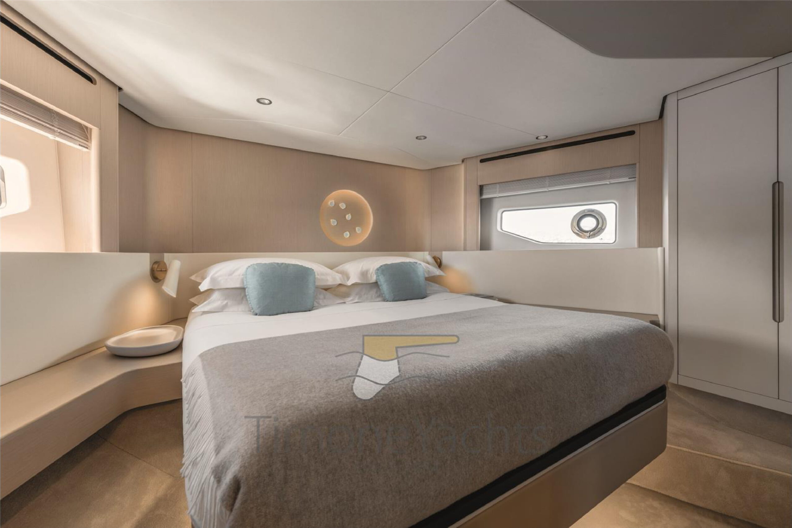 fluid furniture in light brushed oak blends with natural textiles in neutral nuances and occasional mahogany accents, fully unfolding the harmonious essence of the Fly 68. The contemporary appeal of the Fly 68 is expressed through the possibility to choose among three main deck configurations, each imagined to suit unique onboard living styles and desires. From a more easy-going galley placed at the entrance to the more sensual solution of the semi-hidden “Lanterna” layout, the rest of the space is designed to adapt, ensuring that the midship main deck always hosts a multi-purpose lounging experience