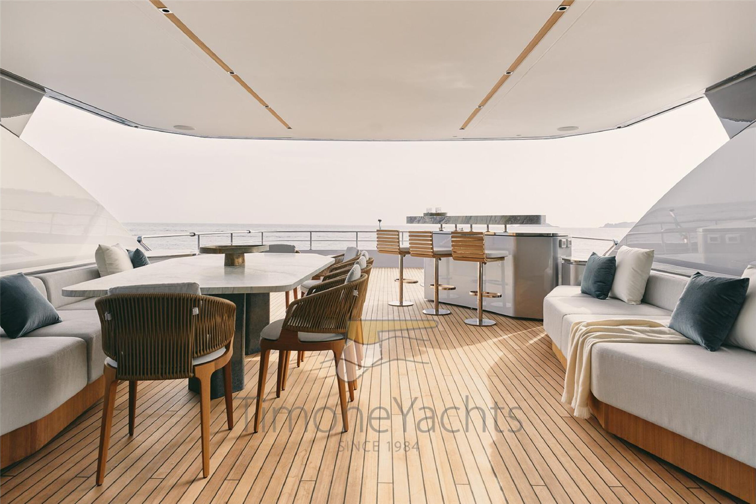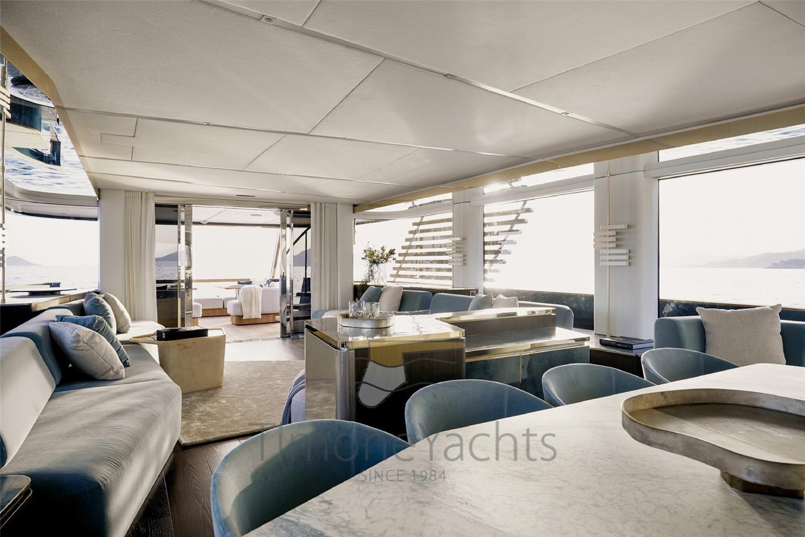 A refined aesthetic that enhances the yacht’s timeless appeal. The design approach on board the Magellano 30M harmonizes with the yacht’s exterior, bringing the elegance of the late 19th century colonial style into the modern era without resorting to clichéd classical references. Specifically, the lateral louvres that sign the flanks of the exterior are reinterpreted as Venetian blinds for the interiors. Characterized by unexpected geometries, the bow hosts a large lounging area, laid out as an archipelago of islands at various heights. The variety of thickness in the upholstery defines each furnishing’s function as seat or sunbed. The forelounge can also be equipped with a jacuzzi. The Main Deck’s layout emphasizes openness and unobstructed views. Low-profile furnishings and a lack of visual barriers allow guests to fully appreciate the panoramic sea views. The saloon features plush, movable sofas that facilitate conversation and interaction, creating a warm and inviting atmosphere. A central dining area is framed by a ceramic panel that blend glossy and matte finishes, adding a sophisticated touch reminiscent of 1930s design. The use of wood flooring and integrated lighting enhances the sense of space and continuity from the cockpit through to the bow. The full-beam owner’s suite on the Main Deck offers a luxurious retreat with floor- to-ceiling windows providing uninterrupted sea views.
