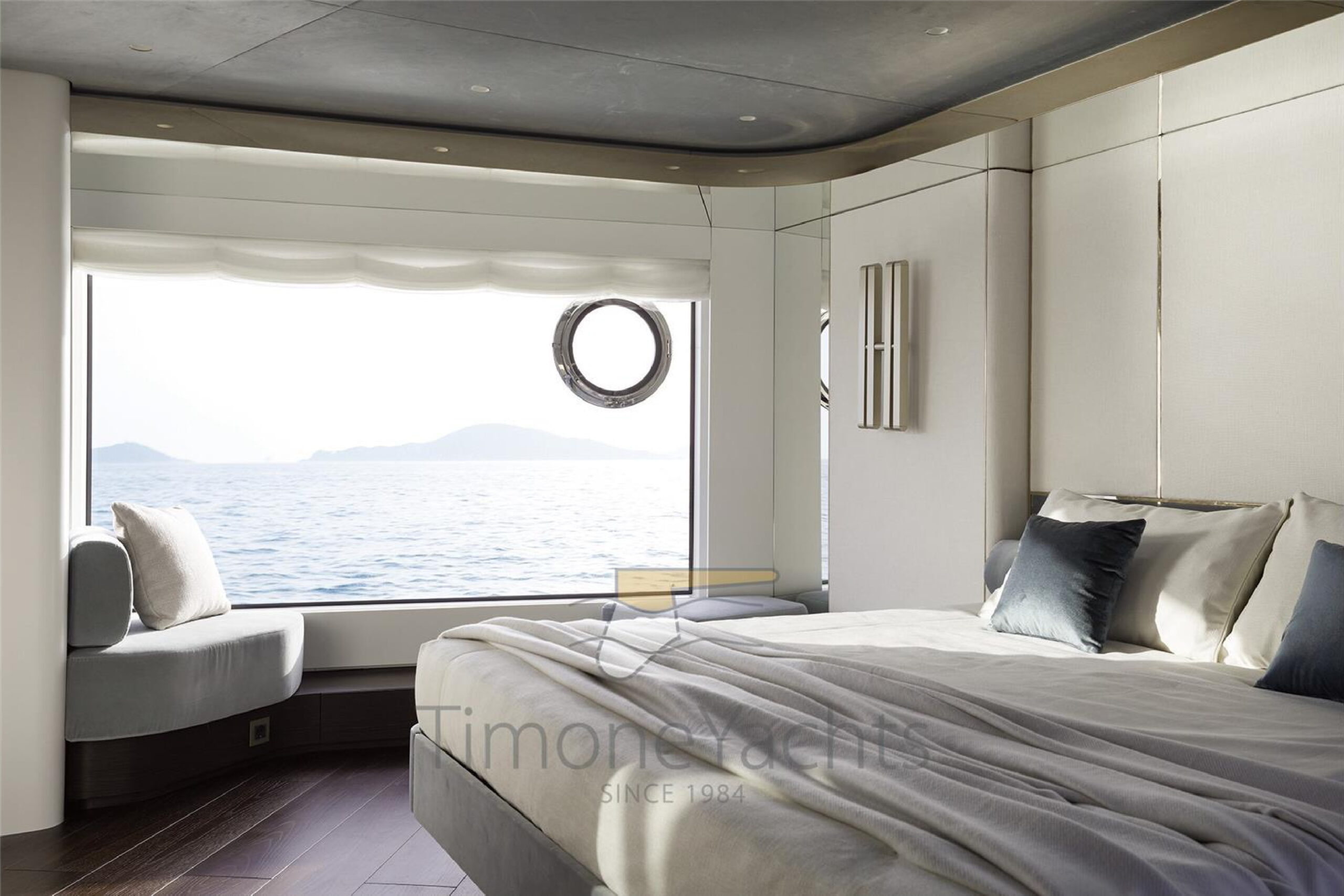 The interior features a blend of warm materials and soft, flowing lines. The use of Fior di Pesco marble, the teak and bronze accents and the custom-designed headboard lend the room an extreme elegance.The en suite bathroom is equally opulent, with brushed bronze fittings and a teak- lined shower. On the Lower Deck, guests are accommodated across two VIP cabins and two guest cabins, each designed with the same attention to detail. The cabins feature travertine stone finishes, integrated lighting, and thoughtful storage solutions. The VIP cabins include vanity areas and en suite bathrooms with silver-brown travertine finishes and brushed bronze fixtures.