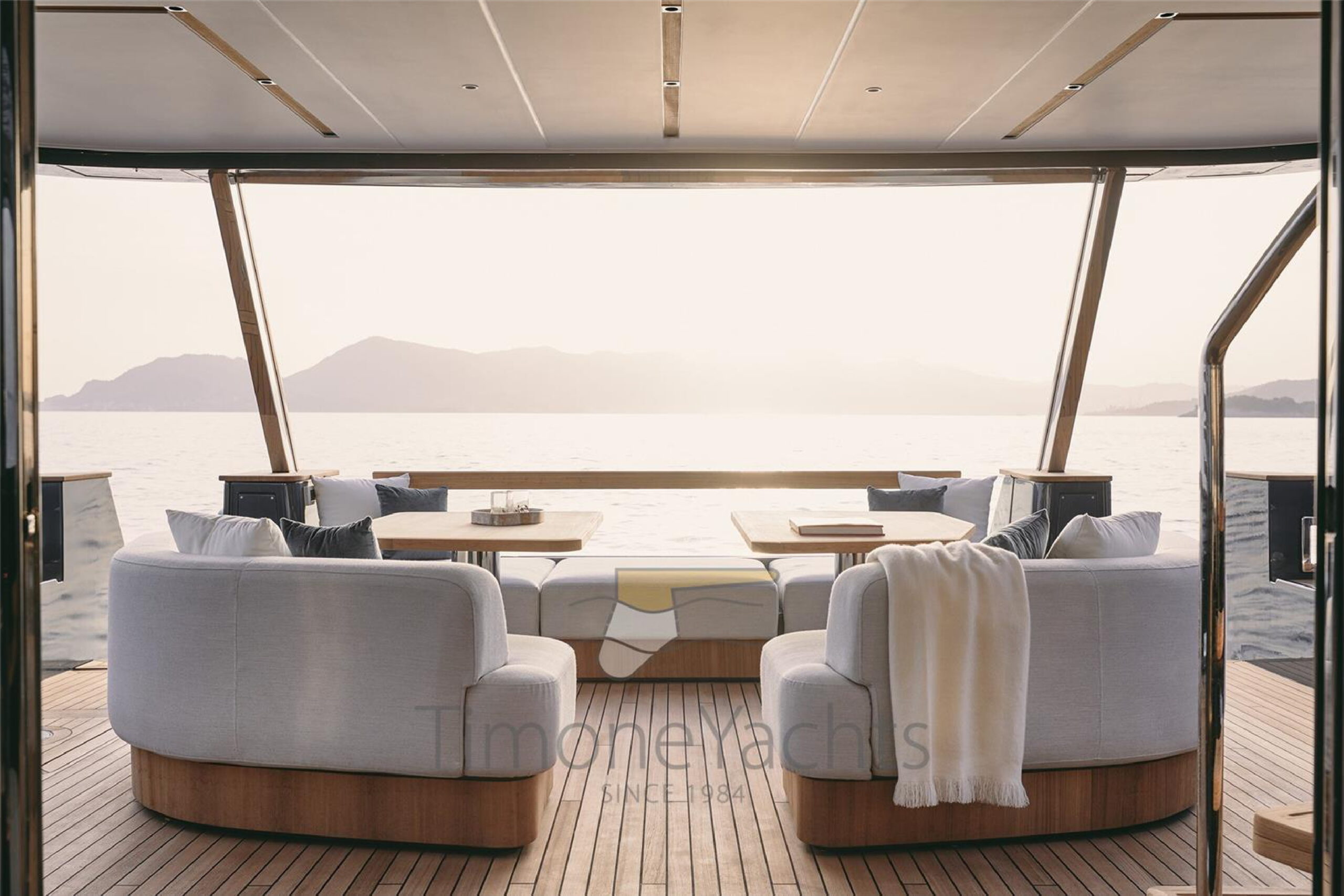 Exuding a sense of precious freedom, the Magellano 30M crossover emancipates a longing for authentic exploration. Constructed to excel in navigation to fascinating far-off destinations, she ignites the spark of curiosity and encourages spontaneous travel aspirations. The inspired interior ambience breathes elegance and abundance, with maximized spaces and luminosity further summoning the tantalizing feeling of onboard liberty. Travel into freedom with the Magellano 30M. The exteriors of the Magellano 30M bear the signature of Ken Freivokh. His design is guided by the desire for an object of timeless and fascinating beauty, far from fads and passing trends. Characteristic teak louvers bring personality to her profile, venturing further into the unmistakable style of the series. Designed for long voyages in total comfort, the Magellano 30M is outfitted with high bulwarks and large windows to safely immerse guests in the marine environment. The transom hatch rotates down to create a pleasant platform on the sea, and may go even further to present a slide, easing the launch of the tender and jetski from the garage.
