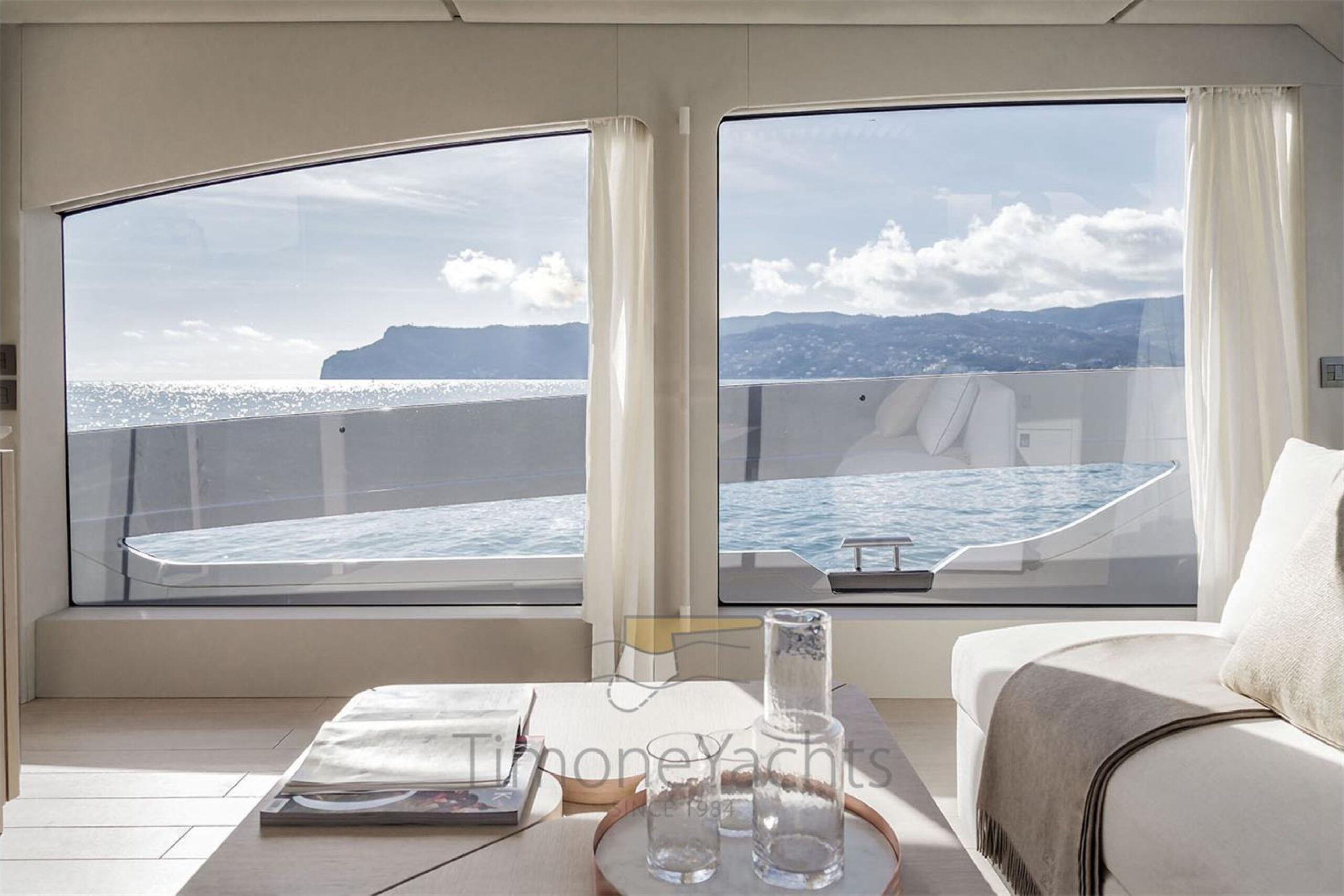and product development, which have enabled the creation of a yacht series that is highly energy efficient, environmentally and fuel efficient, without renounce performance. From his earliest sketches, Alberto Mancini explored the idea of naturally connecting the exterior with the interior aboard the Seadeck Series. He modulated the taught and dynamic lines to achieve a unique and more sinuous effect, thus defining the infinite space of the Fun Island. Conceived to deliver a complete return to nature, the Fun Island is an open aft lounge designed by Alberto Mancini, which offers a sea-immersive experience and a convivial setting at once. Reimagining onboard life, this innovative concept transforms into a unique space when the large windows are open,