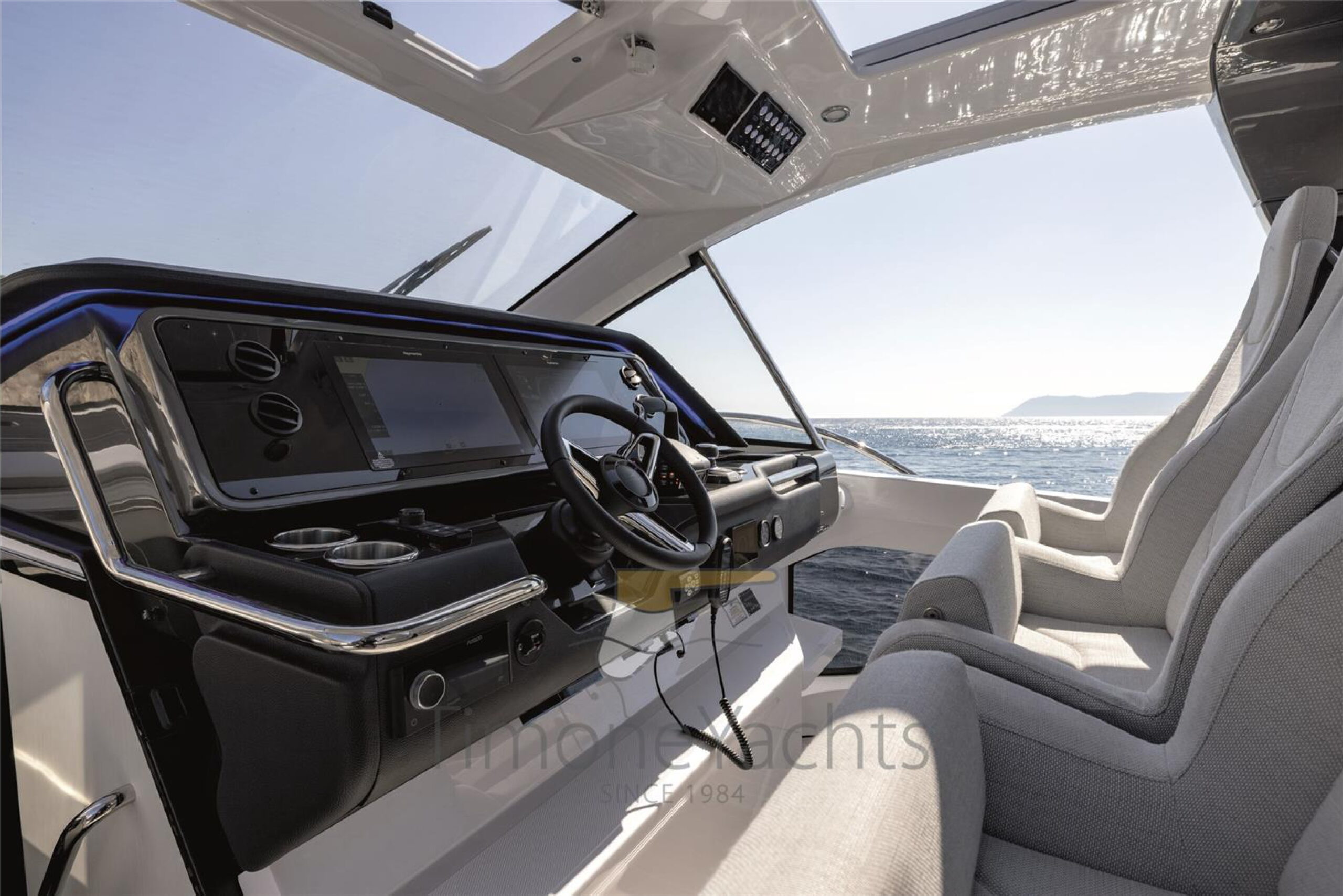 The compact but comprehensive cabinet contains all you need for your onboard entertainment, including a wet bar, fridge, ice maker, barbecue, cooking hob, dishwasher and height-adjustable TV. Designed to place you as close to the sea as possible, the cockpit features a side panel that
