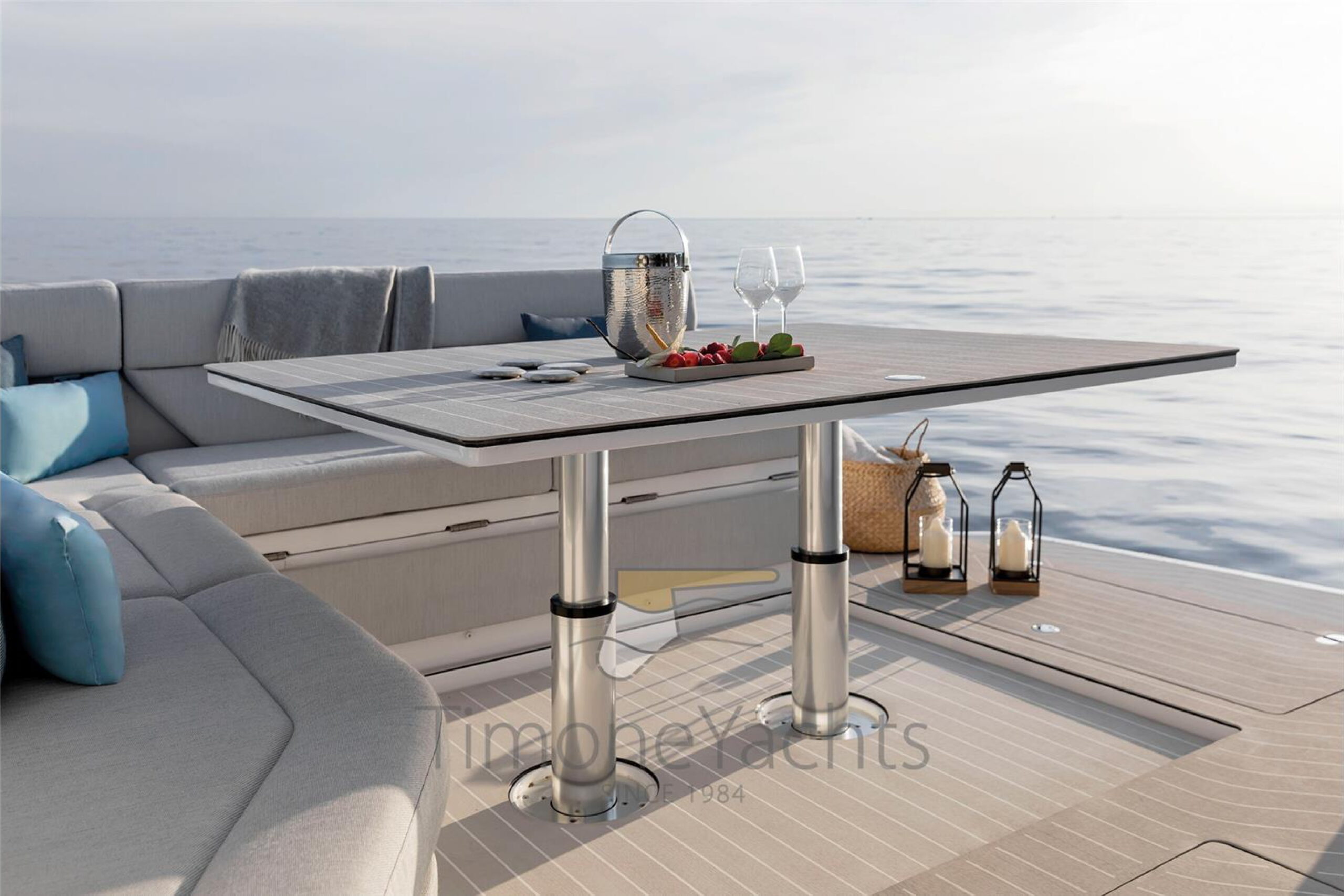 The asymmetrical split-level layout of the bow is designed to maximize comfort and keep contact with the sea. Up top is an ample, cushioned sunbathing area while just below is a versatile al fresco lounge & dining zone with a six-person table embraced by an inviting C-shaped sofa.